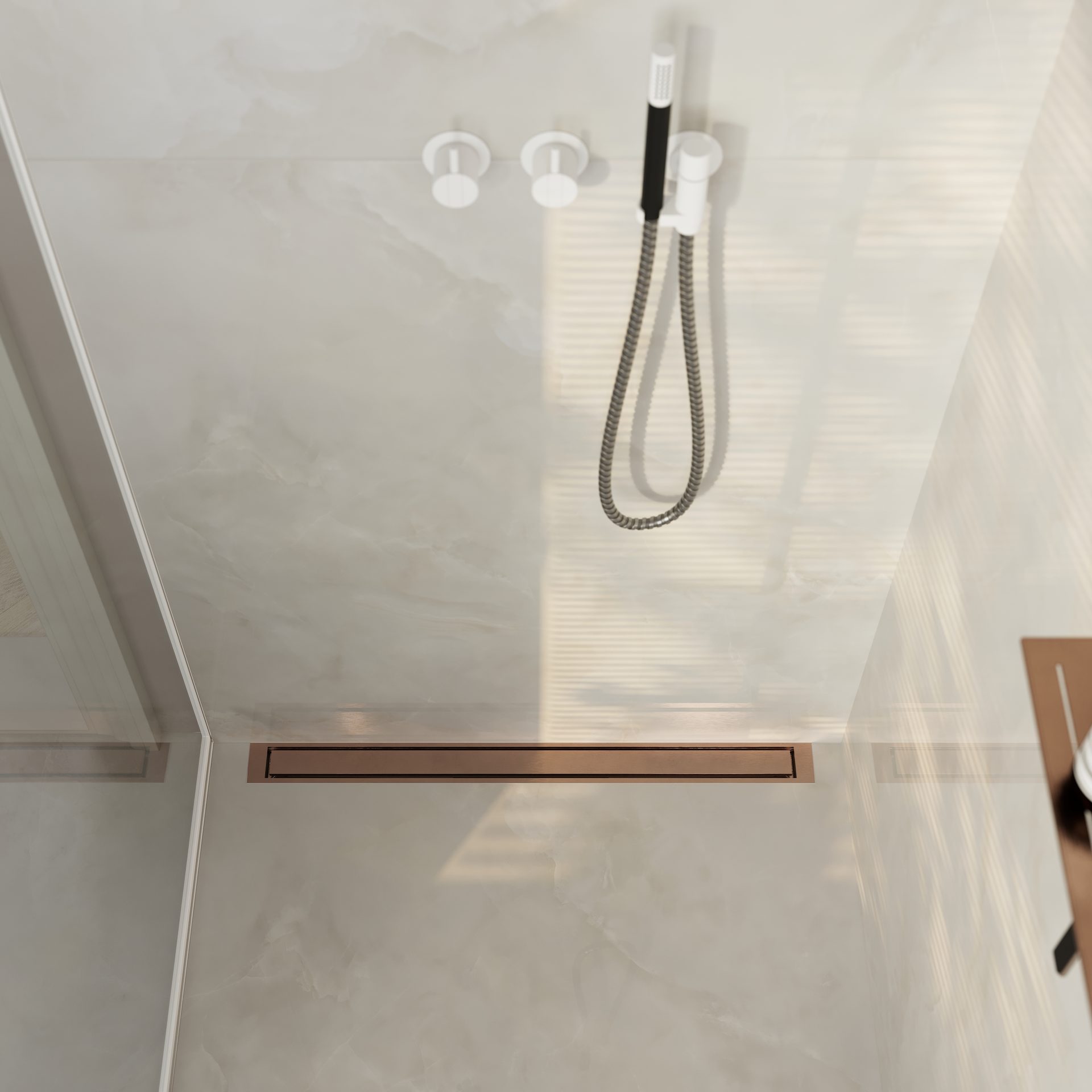 Ramen framhäver golvbrunnens eleganta design. Finns i ramhöjderna 10, 12, 15 och 25 mm. Höjden väljs beroende på tjockleken på klinkerplattan. Ramen ska vara c:a 2 mm högre än tjockleken på klinkerplattan. Ramen har en gummiinsats som förstyvning och styrtappar i ändarna så den passar perfekt i armaturen. Ramens övre del är en 4 mm tjock solid del av rostfritt stål. PVD färgad i kopparfärg.