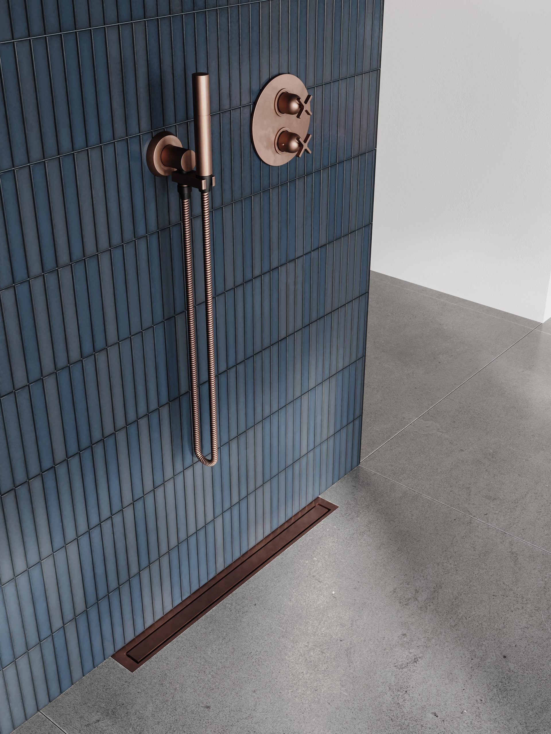 HighLine är Unidrains exklusiva och prisbelönta designserie där det klassiska gallret ersätts av en panel av borstad stål. I sortimentet ingår även den diskreta HighLine Custom, där en klinker liknande det övriga golvet fästs för att skapa ett nästan osynligt avlopp. HighLine har även vidareutvecklats till HighLine Colour där vi har lagt till nya ytbehandlingar och färger, för att göra det lättare att matcha detaljerna i badrummet. HighLine Colour finns i handpolerat rostfritt stål, mässing, koppar och svart, allt i PVD-behandlat borstat rostfritt stål.